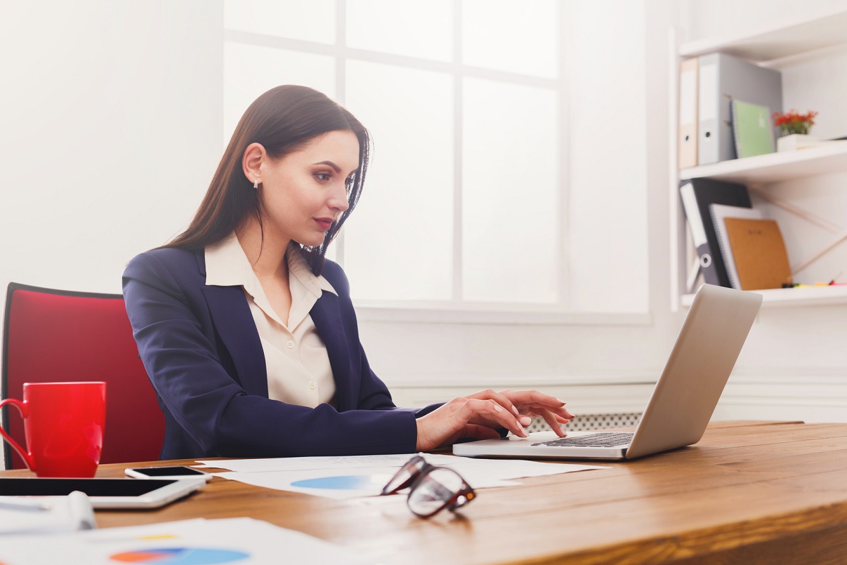 B October 6, 2017Full resolution (1200 × 800) ← Previous Next → Business woman working on laptop at office. Businesswoman typing something on computer while sitting at her working place, copy space